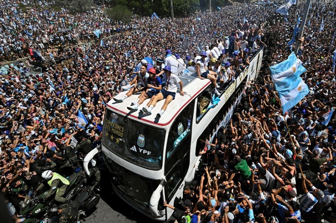 Cuộc diễu hành bằng xe buýt mui trần trên đường phố thủ đô Bueno Aires diễn ra trưa 20/12 để người dân có thể ăn mừng cùng đội tuyển bóng đá quốc gia vừa đoạt chức vô địch World Cup 2022, giải bóng đá lớn nhất hành tinh. Theo ước tính, khoảng 4 triệu người đã tham dự cuộc diễu hành này, tạo thành những đám đông chật kín trên quãng đường di chuyển của đội tuyển.