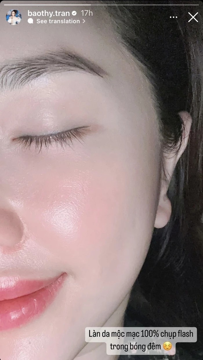Cụ thể, trong ảnh Bảo Thy tự tin khoe làn da “không tỳ vết” được chụp qua ánh đèn flash. Có thể thấy, dù chụp ở góc cận, nữ ca sĩ vẫn không bị lộ chút khuyết điểm về mụn hay lỗ chân lông, thay vào đó, làn da trắng hồng căng bóng của người đẹp 8x khiến người hâm mộ không khỏi xuýt xoa ngưỡng mộ. Bảo Thy tự hào: “Làn da mộc mạc 100% chụp flash bóng đêm”.