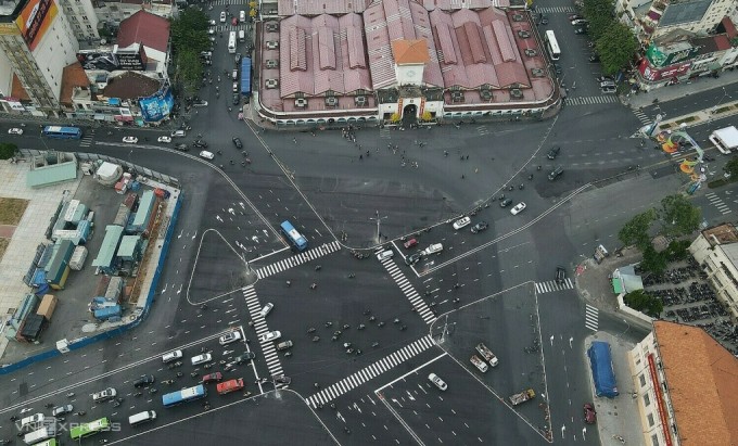 Giao thông trước chợ Bến Thành được tạm thời tổ chức theo dạng ngã tư. Ảnh: Đình Văn