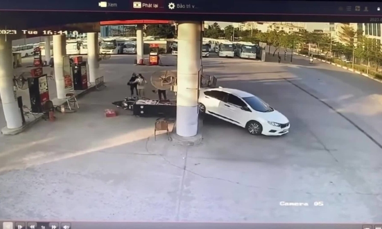 Tình huống: Gần 17h ngày 3 Tết (24/1), chiếc Honda City lùi vào trạm xăng trên phố Trần Vỹ. Ban đầu xe lùi chậm rãi, nhưng khi còn cách cột bơm khoảng gần 2m, xe tăng tốc rồi ủi đổ cột xăng. May mắn một nhân viên bơm xăng và hai khách đi xe máy phía sau kịp tránh, không có thương vong.