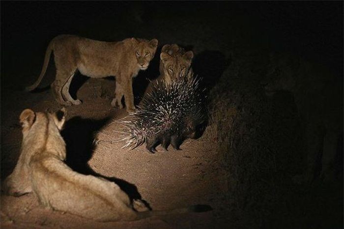 Lúc này khoảng 5 con sư tử cái, những con vật chịu trách nhiệm đi săn chính trong đàn, đã vây chặt xung quanh con nhím.
