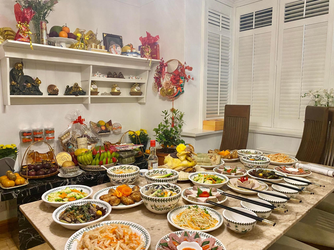 Mâm cỗ cúng Tết đầy đủ món ăn truyền thống của ông bố Việt đang sống ở Anh.