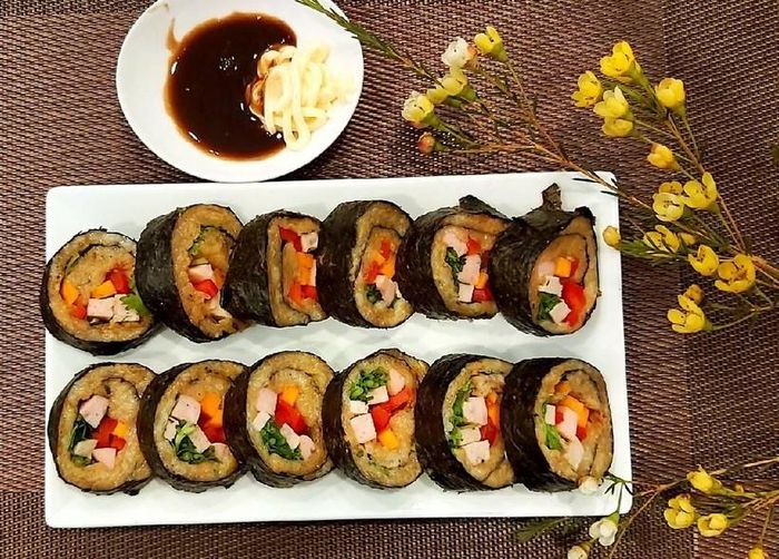 Đặt tấm rong biển lên mặt phẳng, dàn đều bánh chưng tạo độ kết dính rồi đặt các nhân có sẵn hoặc còn tồn đọng sau Tết như giò, xúc xích thái sợi dài, rau củ, trứng rán... vào và cuộn lại thật chặt tay.