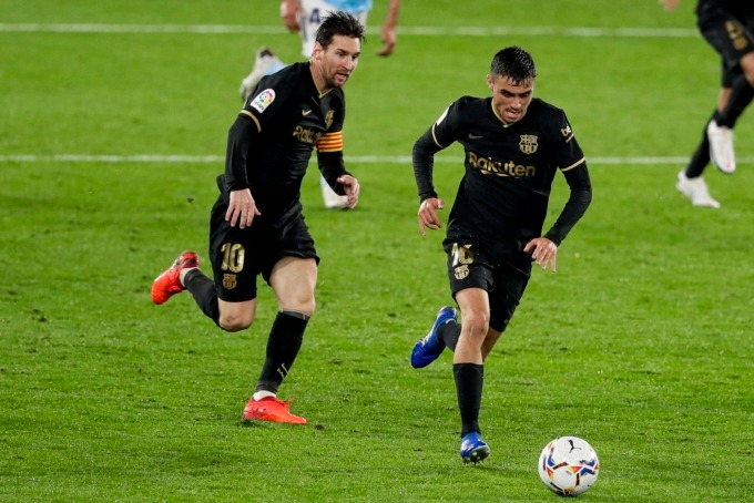 Messi và Pedri trong một tình huống lên bóng của Barca ở La Liga mùa 2020-2021. Ảnh: AFP