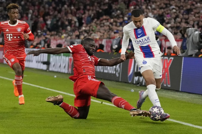 Upamecano (giữa) kèm chặt Mbappe trong trận Bayern - PSG tối 8/3. Ảnh: Icon Sport