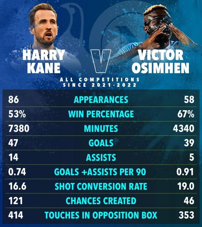 Trong 86 lần ra sân so với 58 trận của Osimhen, Kane ghi 47 bàn và kiến tạo 14 lần.