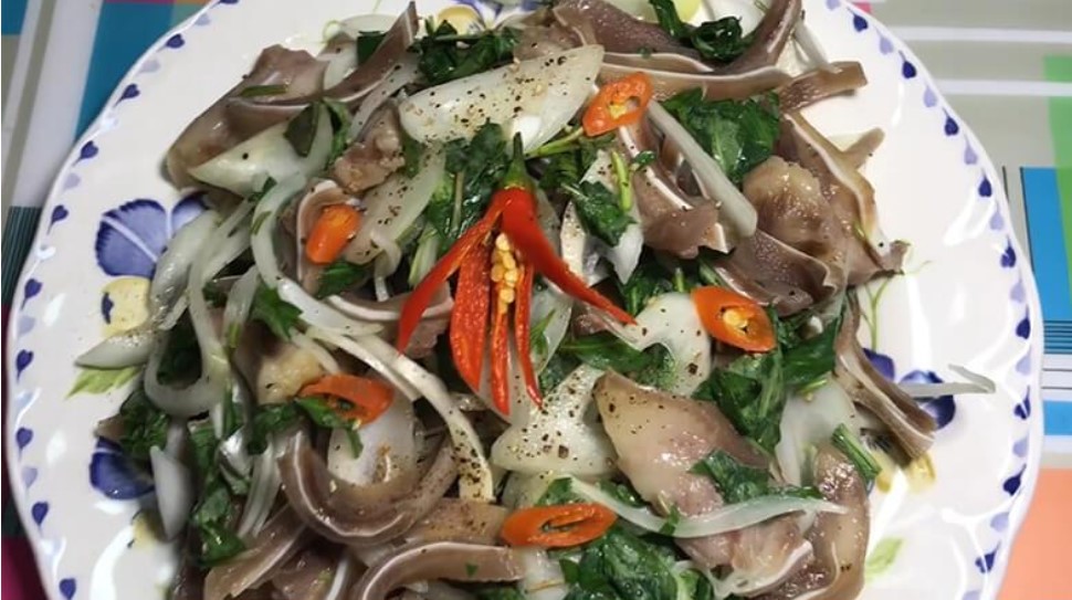 Cuối cùng, bạn chỉ cần trộn phần tai heo đã cắt mỏng cùng với 1 muỗng cà phê muối và nửa muỗng cà phê tiêu vào một cái tô. Cho hành tây, rau răm, ớt và nước cốt chanh đã chuẩn bị vào và tiến hành trộn gỏi.