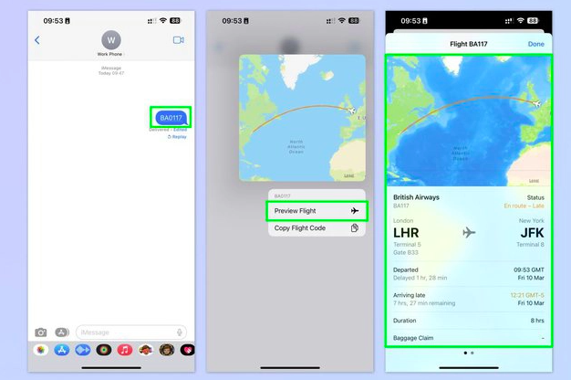 Hãy tưởng tượng chuyến bay người thâm của bạn tham gia là LA8085 và họ vừa gửi cho bạn thông tin chuyến bay đó. Hãy nhấn và giữ tin nhắn rồi nhấn vào Preview Flight (Xem trước chuyến bay). Bạn sẽ thấy mọi thứ cần biết về nó.