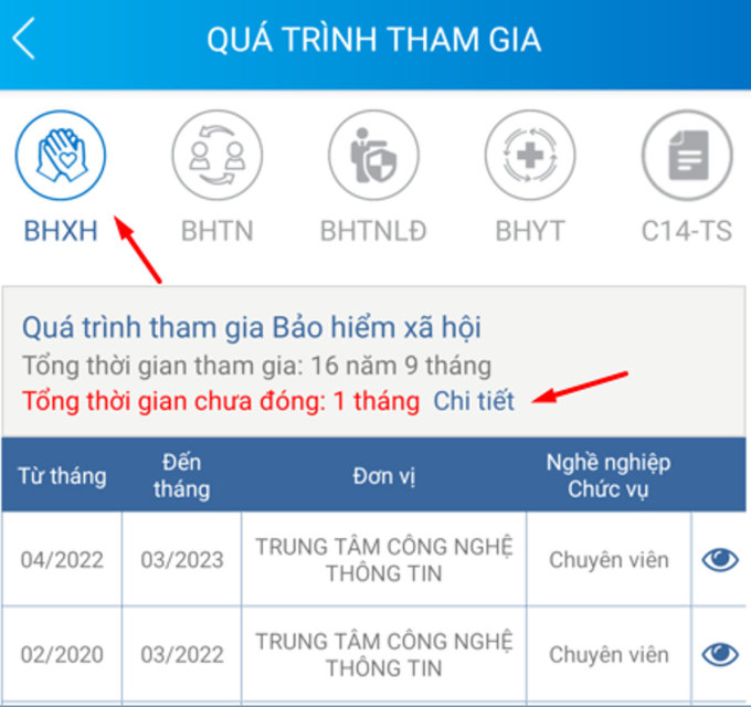 Người lao động có thể kiểm tra thời gian bị chậm, nợ đóng BHXH, bảo hiểm thất nghiệp thông qua ứng dụng VssID. Tại phần Quá trình tham gia, nếu hệ thống hiển thị thời gian chưa đóng, người dùng chọn xem Chi tiết để biết doanh nghiệp và số tháng bị nợ.