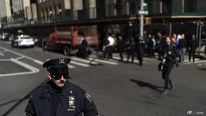 Cảnh sát New York đứng gác gần tòa án quận Manhattan ở bang New York (Mỹ) ngày 21-3 phòng khả năng có biểu tình sau cựu Tổng thống Donald Trump bị truy tố. Ảnh: AP