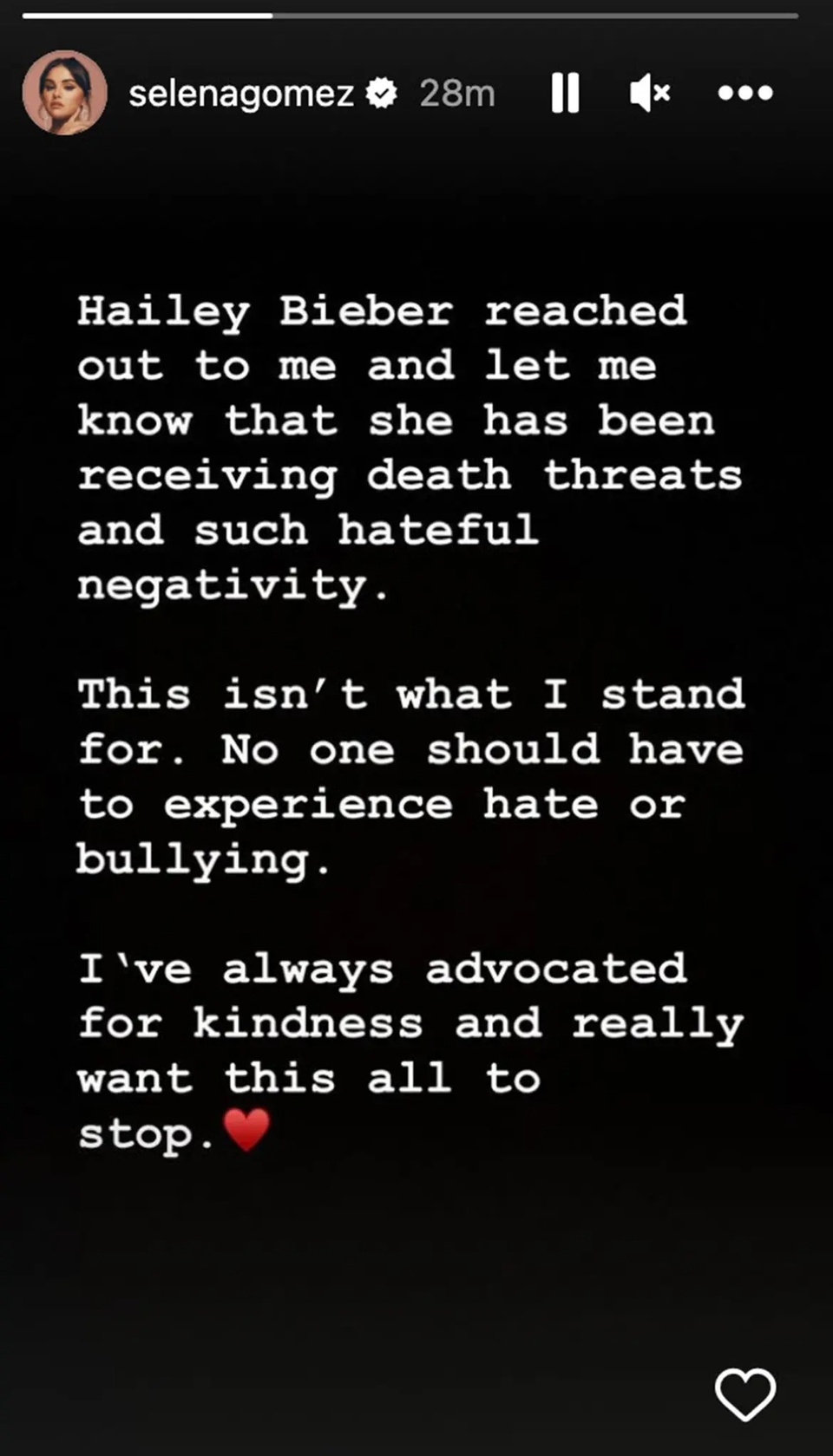 “Hailey Bieber vừa mới liên hệ và kể cho tôi biết rằng cô ấy đang nhận được rất nhiều lời lẽ công kích cực kỳ tiêu cực, thậm chí là bị dọa giết. Đây là những hành động mà tôi kịch liệt lên án. Không ai xứng đáng phải chịu đựng những sự thù hằn hay bắt nạt như vậy cả. Cá nhân tôi luôn đấu tranh vì điều tốt và thực lòng mong rằng những hành vi xấu xí như vậy sẽ chấm dứt”, Selena viết.