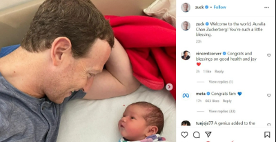 Zuckerberg thông báo vợ của ông vừa sinh con thứ ba. Tên của cô bé là Aurelia. Ông cũng chia sẻ hình ảnh của em bé trên Instagram và gọi cô bé là “phước lành bé nhỏ”. Bức ảnh nhận được hơn 1 triệu lượt thích sau 20 giờ đăng tải.