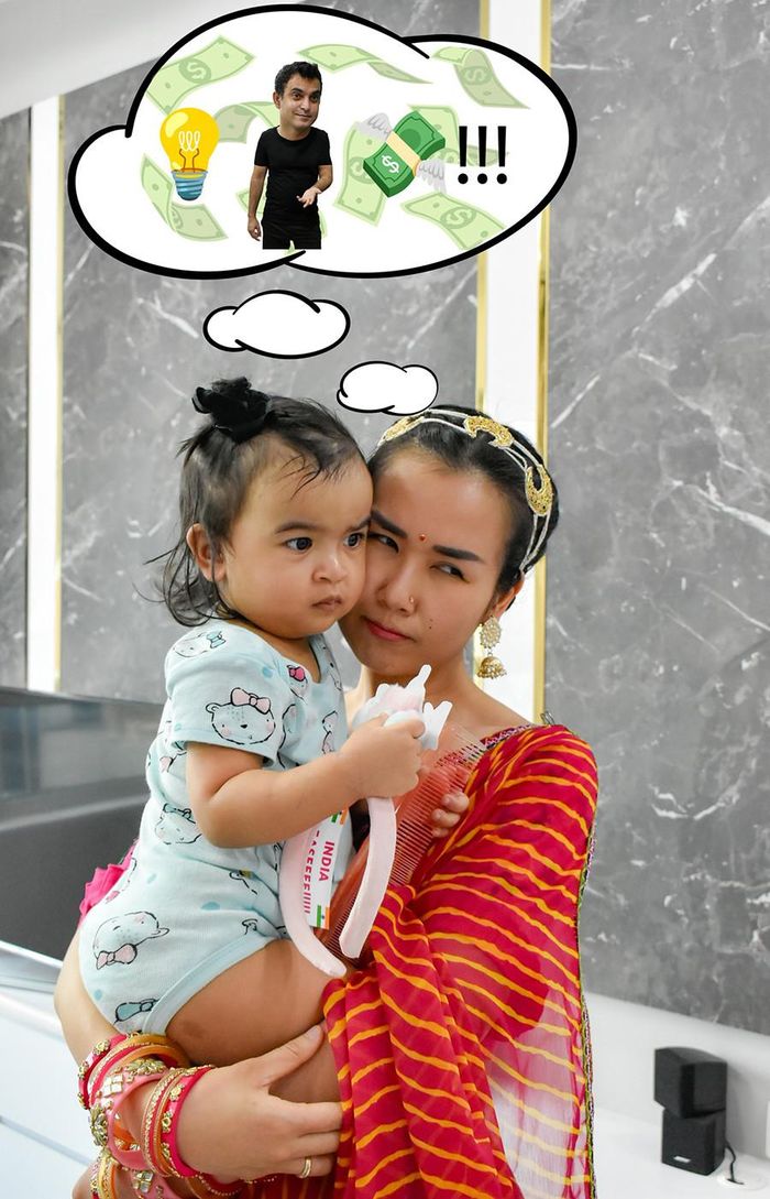 Võ Hạ Trâm mặc sari - trang phục truyền thống của Ấn - và nhờ con gái làm “phụ tá” giúp mình kêu gọi tài trợ từ “nhà tài trợ” Vikas. Cô hài hước viết: “Anh xã Vikas nhà mình vừa bị hai đối tượng ‘dụ dỗ’ mất 5 tỷ rồi các mẹ ơi! Sắp Cá tháng Tư rồi, mấy mẹ nói chồng mình cẩn thận”.