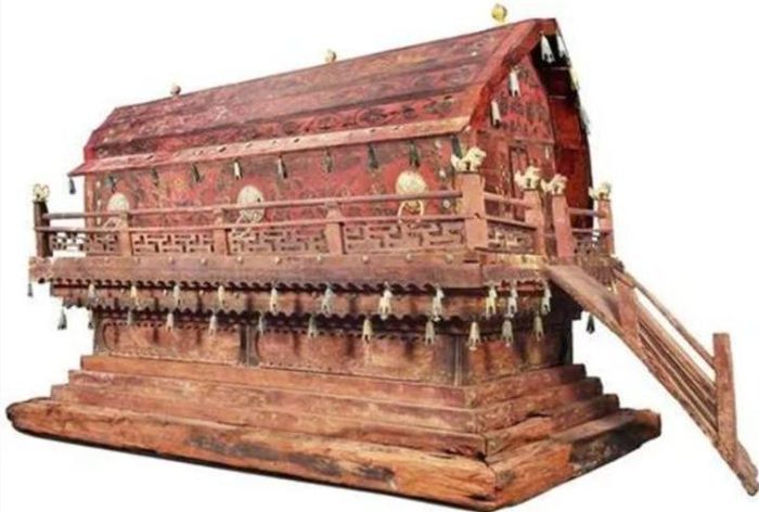 Tuy nhiên, thứ mà các nhà khảo cổ quan tâm nhất lúc này là chiếc quan tài có màu đỏ. Bên trên quan tài có khắc nhiều hoa văn chim phượng, hoa và mây. Xung quanh nắp quan tài treo nhiều quả chuông nhỏ cùng nhiều đồ trang trí khác. Từ đây có thể thấy, chủ nhân của lăng mộ là người thuộc hoàng gia nhà Liêu.