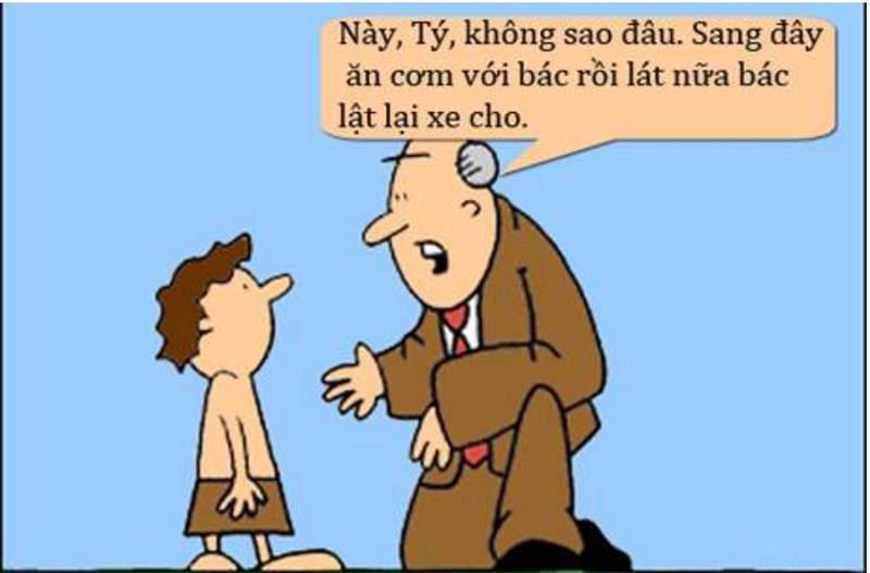 - Này, Tý, không sao đâu. Sang đây ăn cơm với bác rồi lát nữa bác lật lại xe cho.