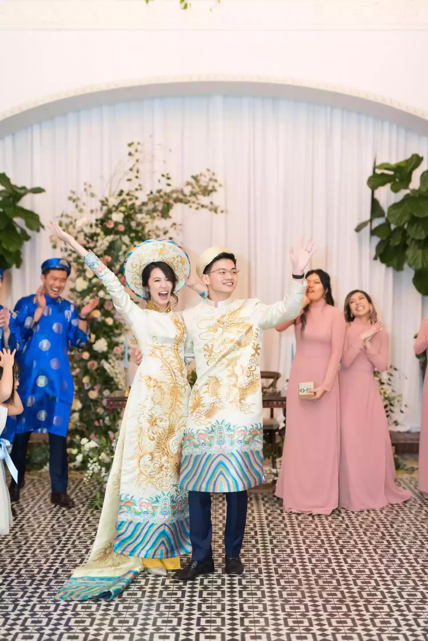 Sau buổi lễ, cặp đôi không quên thay trang phục cưới truyền thống của Việt Nam. Chúng được làm bằng vải lụa và những bông hoa được thêu khá tỉ mỉ.