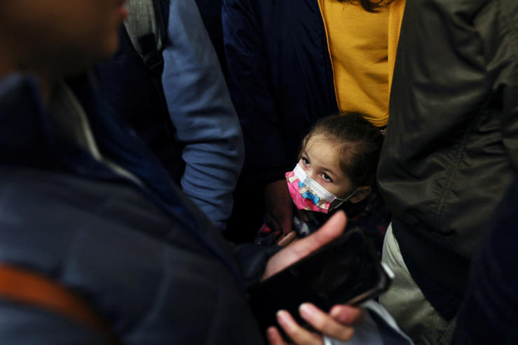 Một trẻ em đeo khẩu trang khi đi tàu điện ngầm ở TP New York - Mỹ hôm 2-5. Ảnh: Reuters