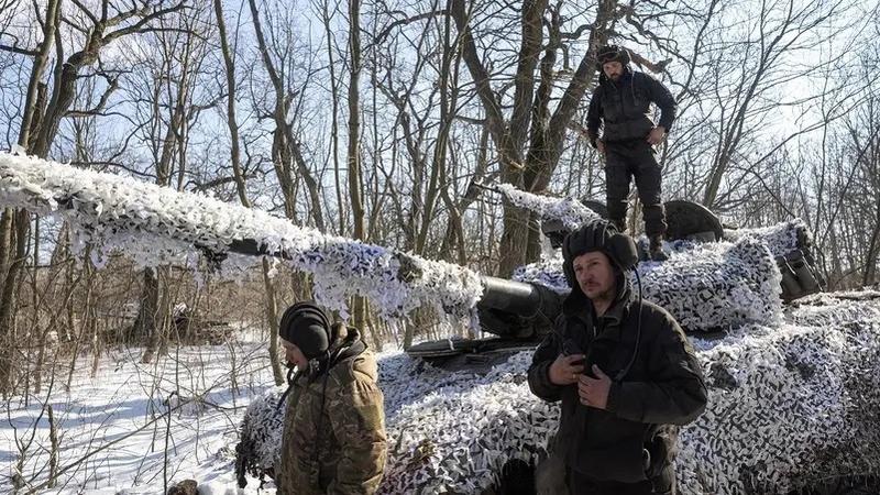 Các quân nhân Ukraine thuộc Lữ đoàn xe tăng độc lập số 17 đứng trước một chiếc xe tăng T-64 gần thị trấn tiền tuyến Bakhmut, vùng Donetsk, Ukraine vào ngày 23 tháng 2 năm 2023. (Ảnh Reuters)