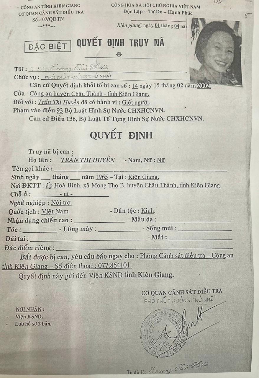 Gây án xong, bà Huyền đã bỏ trốn khỏi địa phương. Ngày 1/4/2002, Cơ quan CSĐT Công an tỉnh Kiên Giang ra quyết định truy nã đặc biệt bà Huyền về tội Giết người.