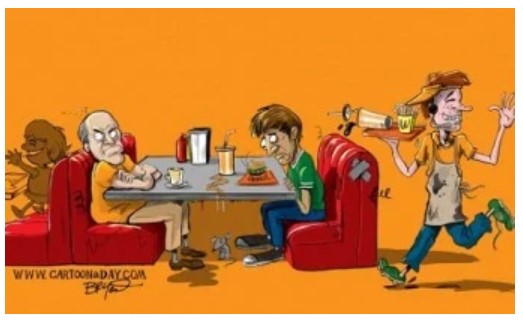 Một tên nhìn sang bàn bên cạnh thấy ông khách đang bực tức vò đầu bứt tóc, quay lại hỏi bạn: