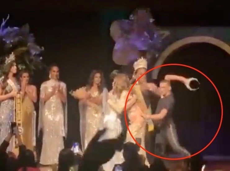 Người đàn ông cố kéo tay á hậu rời khỏi sân khấu sau khi phá hủy vương miện. Ảnh: Jam Press.