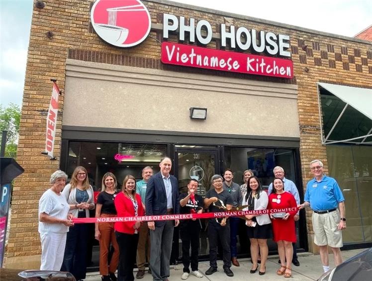 Ông Scott Martin, chủ tịch Phòng Thương Mại Thành Phố Norman, đang cùng chủ tiệm và thành viên của tiệm Pho House cắt băng mừng tiệm khai trương và gia nhập Phòng Thương Mại, trong hình đăng trên Facebook của Norman Chamber of Commerce hôm 10 tháng 5, 2023.