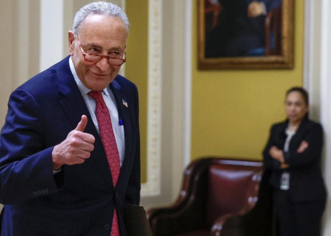 Lãnh đạo Đảng Dân chủ ở Thượng viện Mỹ Chuck Schumer bày tỏ niềm vui sau khi thông qua dự luật lưỡng đảng dỡ bỏ trần nợ tại Đồi Capitol ở Washington hôm 1-6. Ảnh: REUTERS