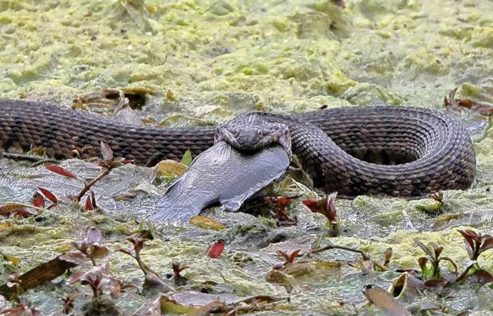 Con rắn dường như đang nhìn về phía camera với con cá trong miệng. Một số bức ảnh khác cho thấy con rắn mở rộng miệng để nuốt trọn con cá.