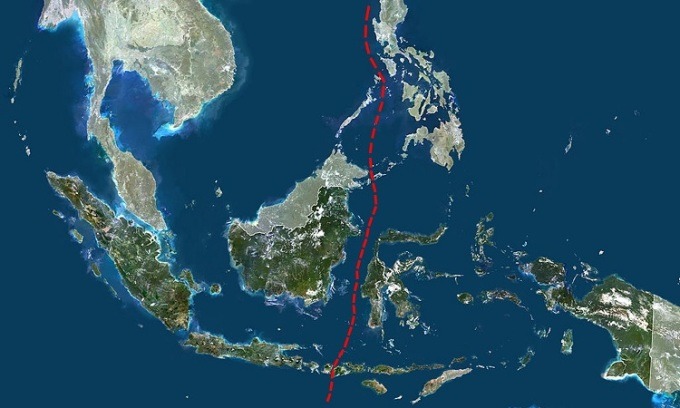 Đường Wallace (màu đỏ) cắt ngang qua Indonesia. Ảnh: Planet Observer/Universal Images Group