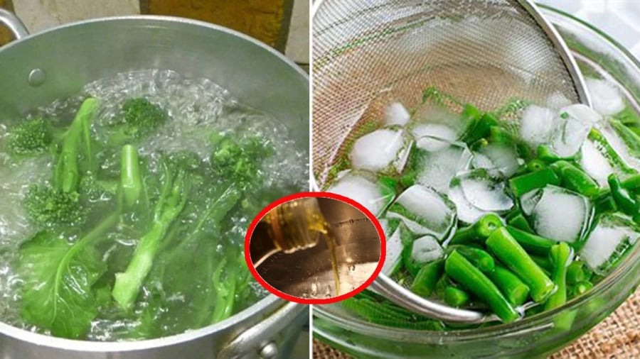 Bạn có thể cho một chút dầu ăn vào nồi nước luộc trước khi vớt rau ra. Nhờ lớp dầu ăn bên ngoài, rau của bạn sẽ xanh và bóng hơn. Với cách này, rau có thể để nhiều giờ mà không bị đổi màu, nhưng lại có chút váng mỡ nên tùy theo khẩu vị của gia đình để bạn lựa chọn nhé.