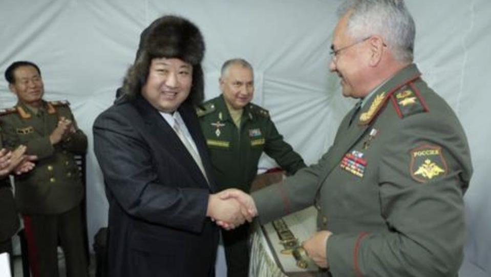 Nhà lãnh đạo Triều Tiên Kim Jong-un đội mũ ushanka của Nga, bắt tay Bộ trưởng Quốc phòng Nga Sergey Shoigu. Ảnh KCNA