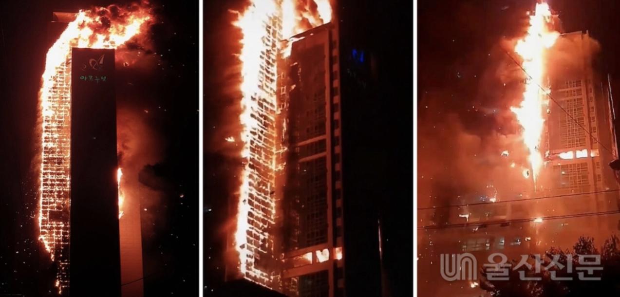 Hình ảnh ngọn lửa bao trùm tòa nhà 33 tầng vào đêm ngày 8/10/2020 (Ảnh Ulsanpress.net)