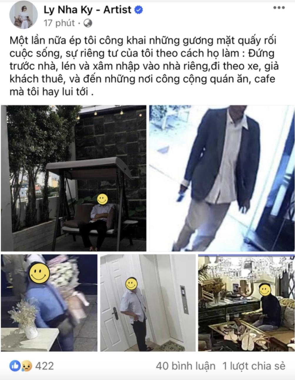 Đính kèm loạt ảnh, Lý Nhã Kỳ viết: "Một lần nữa ép tôi công khai những gương mặt quấy rối cuộc sống, sự riêng tư của tôi theo cách họ làm: Đứng trước nhà, lén và xâm nhập vào nhà riêng, đi theo xe, giả khách thuê và đến những nơi công cộng quán ăn, cà phê mà tôi hay lui tới". Bài đăng của Lý Nhã Kỳ nhanh chóng thu hút sự quan tâm của mọi người. Nhiều ý kiến cho rằng nữ diễn viên nên trình báo cơ quan chức năng, phải cẩn thận và ra vào cần có người bên cạnh.