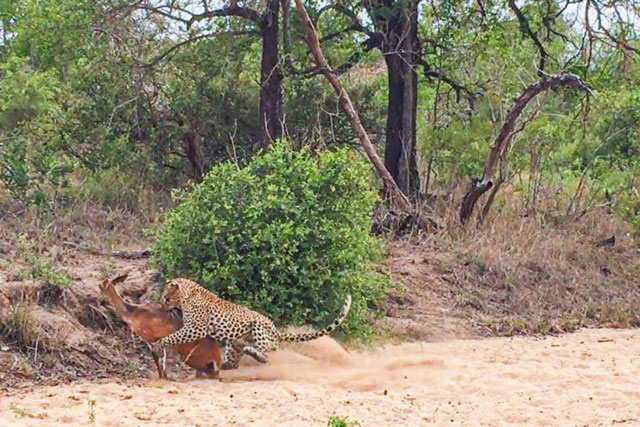 Trông thấy điều này, con báo liền tiến tới và chỉ cần một cú vồ duy nhất, nó đã dễ dàng tóm gọn chú hươu. Sau đó, con báo lôi xác con mồi tới một bụi rậm gần đó để từ từ thưởng thức bữa ăn.