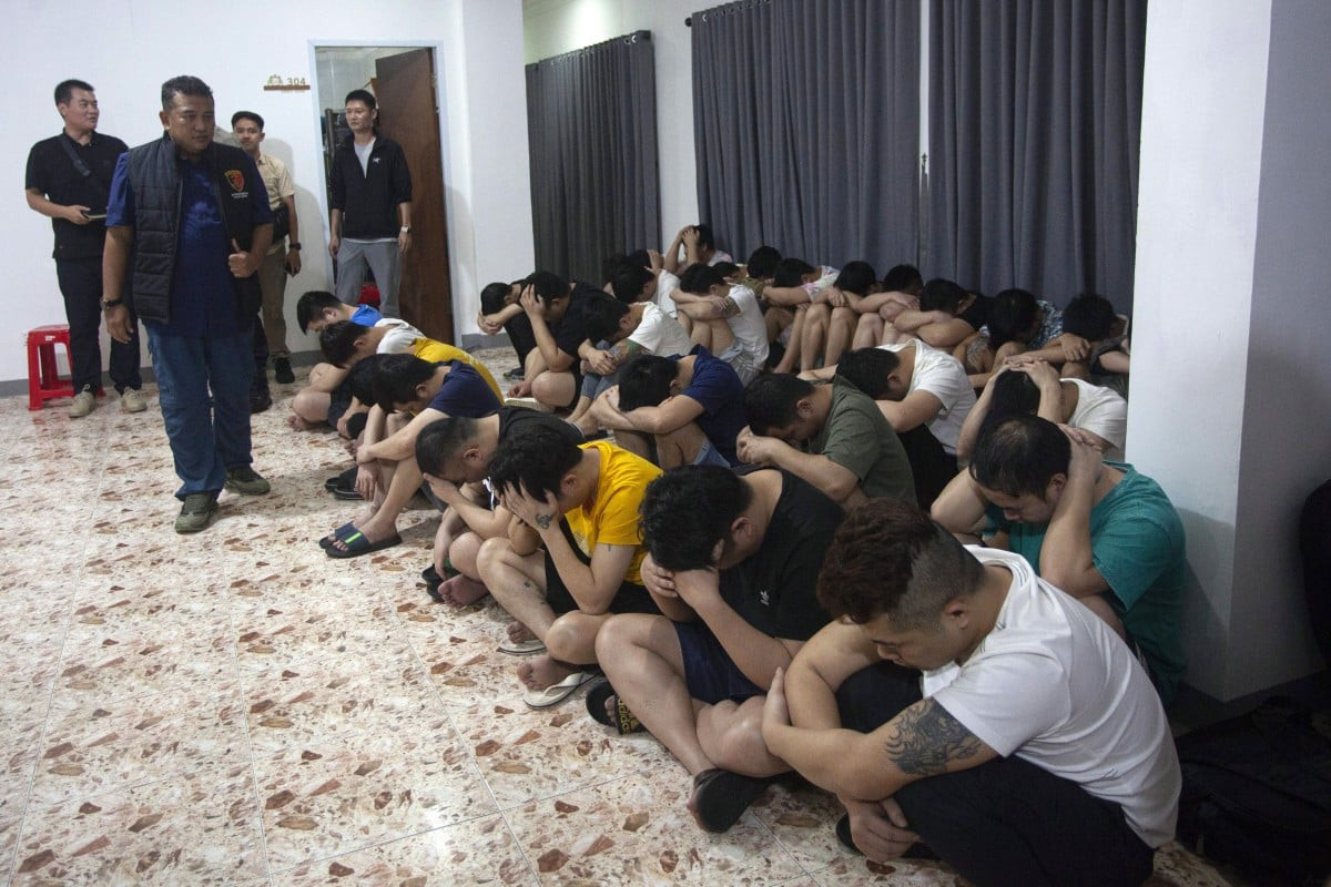 Công dân Trung Quốc bị bắt giữ sau cuộc đột kích vào một căn nhà ở Batam. Ảnh: AP