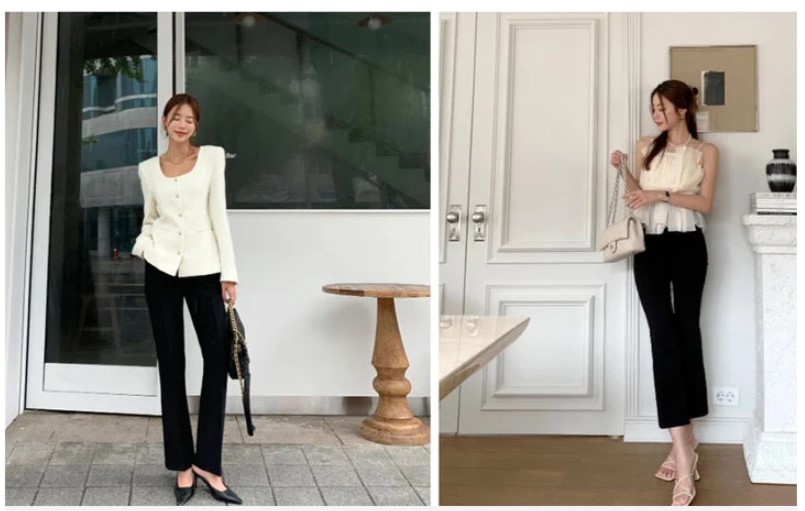 Cụ thể, hãy kết hợp quần âu ống đứng, màu đen với các kiểu áo như áo thun, áo hai dây hoặc áo len cộc tay, các nàng sẽ hoàn thiện được bộ trang phục trẻ trung, phóng khoáng.