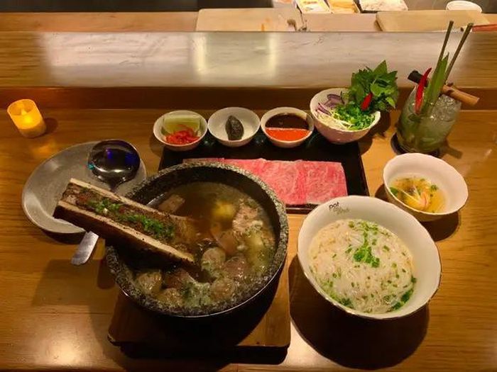 Sau khi thưởng thức một số món khai vị, "nhân vật chính" cuối cùng cũng xuất hiện. Một chiếc bát sâu lòng đựng phần nước dùng đậm đà cùng sáu loại thịt bò khác nhau, bao gồm cả tủy và xúc xích tự làm. Ngoài ra còn có bò wagyu sống được phục vụ kèm theo. Một chiếc bát sứ nhỏ hơn đựng phần bánh phở dai mềm mà không nhũn. Một lòng đỏ trứng trần được đựng trong chiếc bát nhỏ nhất.