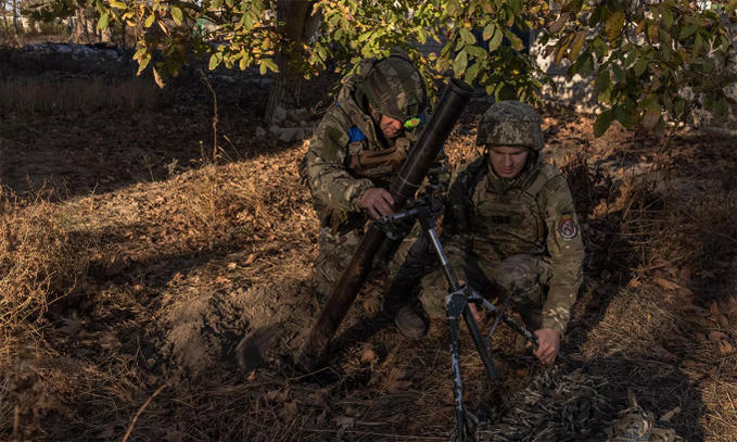 Binh sĩ Ukraine tại bờ tây sông Dnieper chuẩn bị bắn súng cối vào vị trí lực lượng Nga ở bên kia sông ngày 6/11. Ảnh: AFP