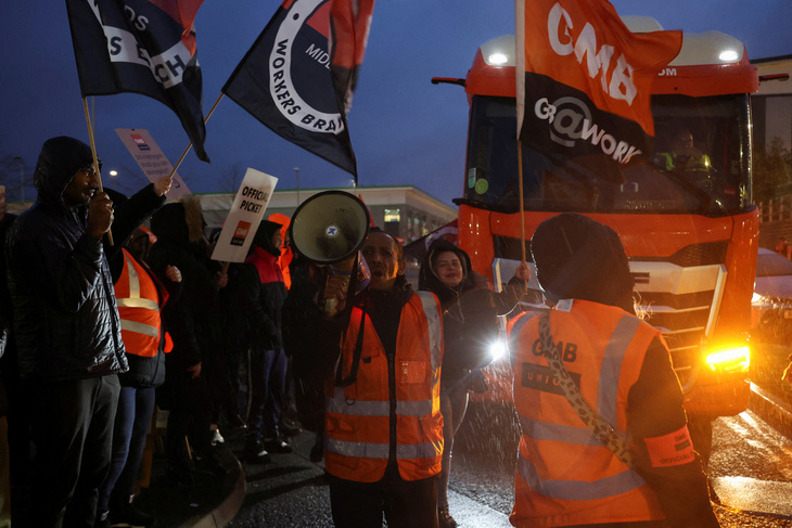 Những người tham gia cuộc đình công bên ngoài nhà kho của Amazon ở thành phố Coventry, Anh ngày 24-11 - Ảnh: REUTERS