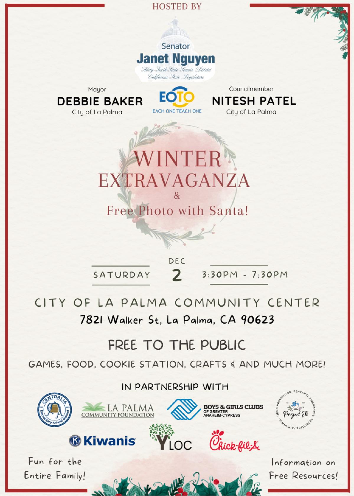 Văn phòng Thượng nghị sĩ Janet Nguyễn thông báo tổ chức chương trình Extravaganza Mùa đông với Thị Trưởng Thành Phố La Palma Debbie Baker, cùng Ủy viên Hội đồng La Palma Nitesh Patel và tổ chức vô vị lợi Each One Teach One. Các gia đình có thể chụp ảnh MIỄN PHÍ với ông già Noel (Santa Clause) và tham gia các trò chơi, nghệ thuật và thủ công, thưởng thức đồ ăn vặt và nhiều hơn thế nữa! Chương Trình miễn phí này hứa hẹn mang đến buổi tối tràn ngập niềm vui, nơi các gia đình có thể quây quần bên nhau và kỷ niệm những ngày nghỉ lễ. Sự kiện được tổ chức vào thứ Bảy, ngày 2 tháng 12, năm 2023; từ 3 giờ 30 chiều – đến 7 giờ 30 tối.