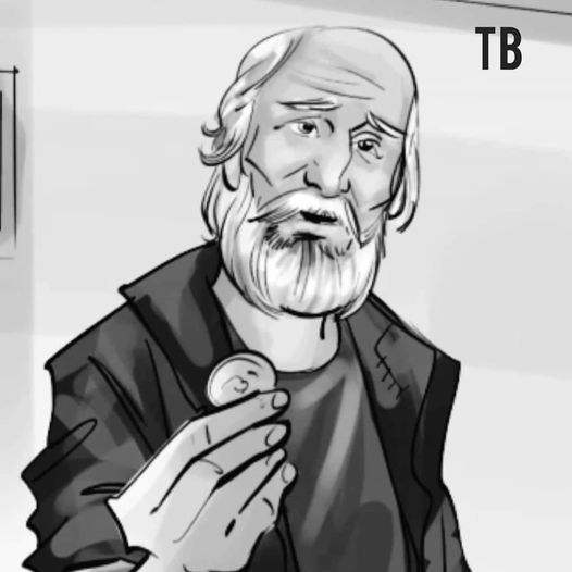 Chàng thanh niên nhìn lại mẩu bánh, anh cũng đói nhưng anh biết họ còn đói hơn anh. Anh cầm cả khay thức ăn đưa hết cho ông lão. Ông lão ăn xin cảm ơn rối rít, rồi lục trong túi xách rách nát đưa cho anh một đồng xu cổ và nói