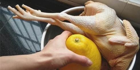 Bước 3: Sau khi massage gà xong, bạn cho phần thịt bưởi (tôm của múi bưởi) vào bụng gà, bạn chắt lấy một ít nước bưởi đổ lên mình gà, không nên vắt hết phần thịt bưởi, chỉ một chút là đủ còn để nhét vào bụng.