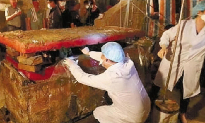 Các nhà khảo cổ đang tiến hành kiểm định cỗ quan tài lạ. (Ảnh: Baidu).