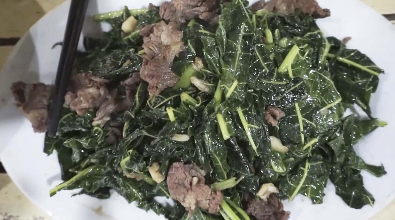Lá đu đủ xào tỏi, thịt bò cực kỳ thơm ngon, hấp dẫn du khách. (Ảnh: Điện máy xanh)