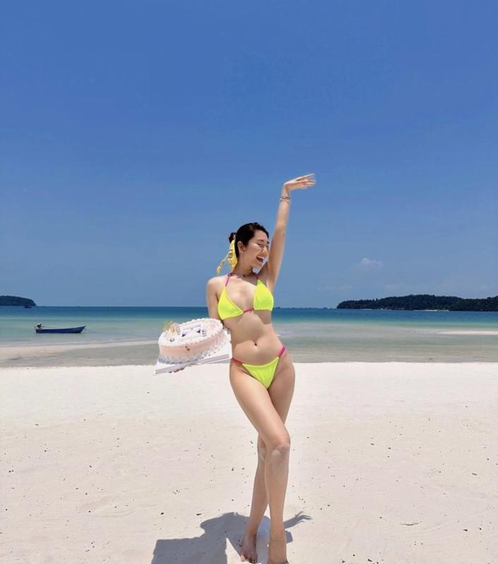 Cầm chiếc bánh sinh nhật đạo dáng bên bờ biển, Thúy Ngân khiến fan 'đứng ngồi không yên' với body 'rực cháy' trong trang phục bikini màu xanh nõn chuối nổi bật.