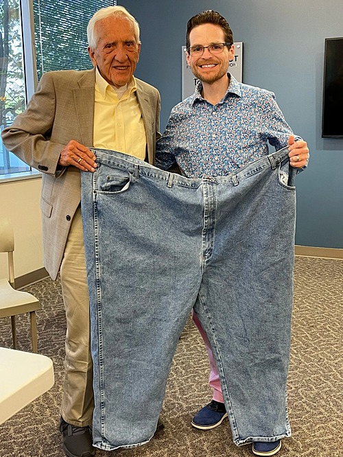 Carroll chia sẻ về chiếc quần jean mà anh ấy mặc khi nặng 190kg, với nhà hóa sinh T. Colin Campbell, tác giả cuốn nghiên cứu về Trung Quốc và người ủng hộ chế độ ăn ít chất béo, toàn thực phẩm thực vật. Ảnh: SCMP