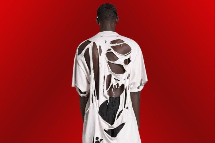 Luôn được biết đến với sáng tạo thời trang độc đáo, thậm chí kỳ dị, nhà mốt Balenciaga thu hút sự chú ý khi trình làng những chiếc áo rách rưới như bị xé rách, cắt nát trong dòng sản phẩm Xuân 2024. Super Destroyed T-Shirt là áo phông oversize, sở hữu mặt trước lành lặn, mặt sau có những khoảng hở như bị giằng xé. Item này hiện không còn nằm trên website của thương hiệu, nhưng từng được niêm yết với giá 783 USD. Còn trên một số nền tảng khác, chiếc áo hiện được bán lại với giá lên đến 1.460 USD. Ảnh: Balenciaga; Đồ họa: Linh Vũ/Znews.