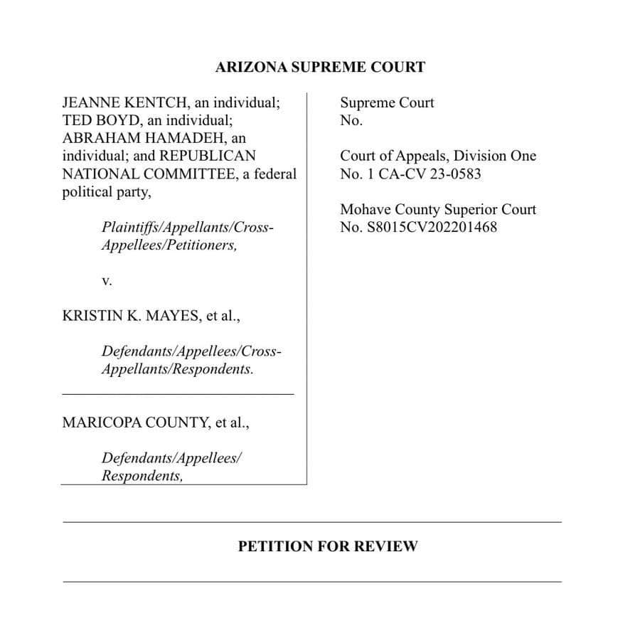 -Mặc khác Ứng cử viên bộ trưởng tư pháp của Đảng Cộng hòa ở Arizona Abe Hamadeh cúng đã nạp đơn lên Tòa án Tối cao Arizona để yêu cầu xem xét kết quả cuộc bầu cử năm 2022 mà ông đã bị đánh cắp. Ông thua đối thủ Kris Mayes, hiện tại là bộ trưởng tư pháp Arizona chỉ có 280 phiếu bầu .Vẫn còn 9.000 lá phiếu chưa được kiểm trong cuộc bầu cử năm 2022. Ông yêu cầu đếm lại 1100 phiếu mà ông biết là phiếu hợp pháp chưa được đếm.
