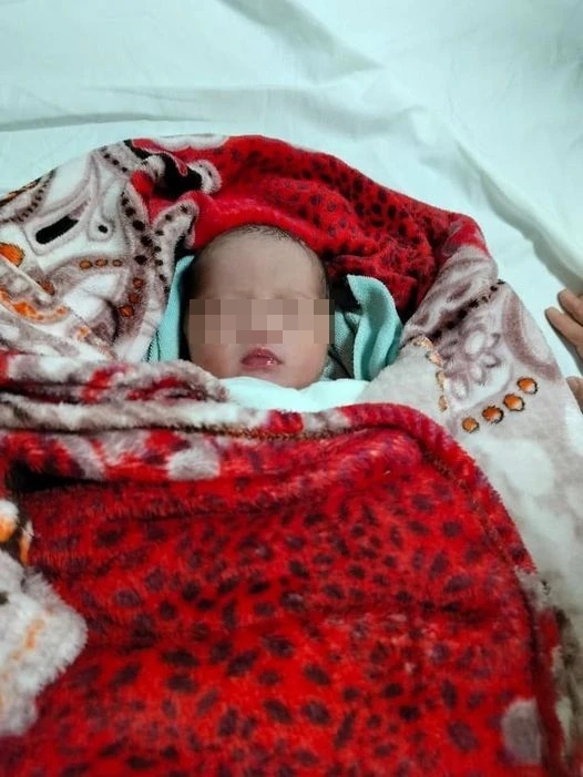 Bé được bọc trong túi nilon màu đen, bên ngoài quấn khăn màu xanh nhạt.