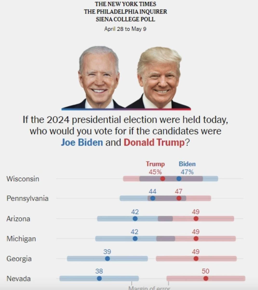 Kết quả thăm dò của New York Times và Siena College được thực hiện từ ngày 28/4 đến 9/5. Ảnh: The New York Times.